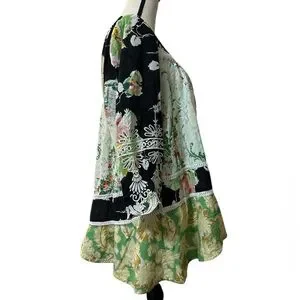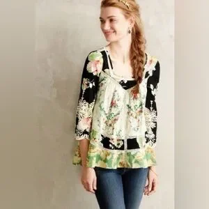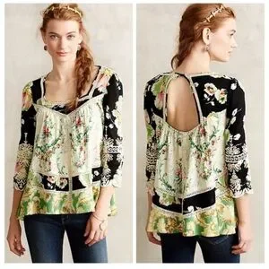 boho top, babydoll silhouette, swing tunic, mixed-print blouse, floral print, peasant style, open-back detail, Anthropologie style, bohemian, eclectic, vintage-inspired, cottagecore, artsy, free-spirited, romantic, whimsical, folk-inspired