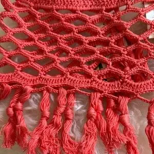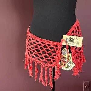 Stylish crochet skirt with fringe detail. Perfect for beachwear. Vibrant red color.