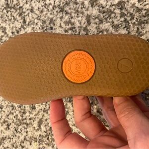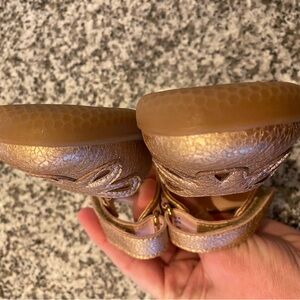 These elegant gold dress shoes by Livie & Luca feature a charming floral cutout design on the closed toe, adding a touch of sophistication. The shoes are crafted from a soft, leather-like material, ensuring comfort and durability. Perfect for special occasions, they offer a secure fit with adjustable velcro straps.