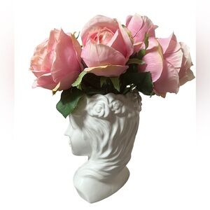 • Beautiful Pink Antique Rose Silk Floral Arrangement in Lady Woman Bust Ceramic Vase