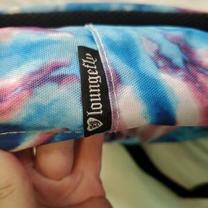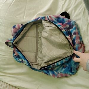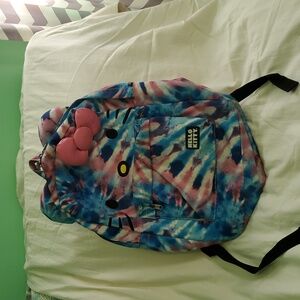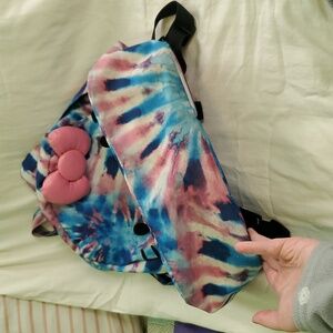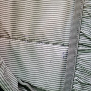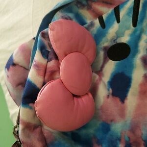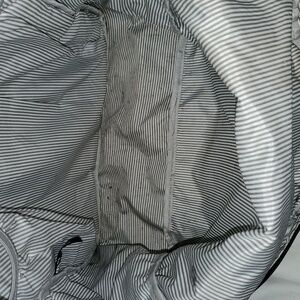 In used condition, has signs of general wear, is a bit dirty in general, has some brown staining on the outside all over in areas from wear, some pen marks and other staining on the inside, has a perfume detergent smell, has wear, scuffs, and stains on bow
