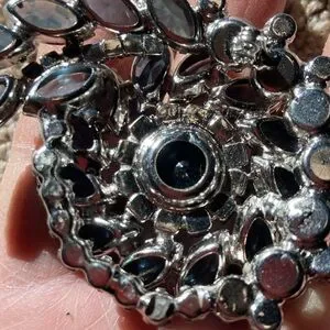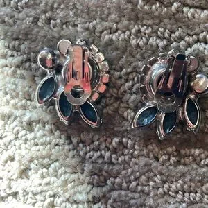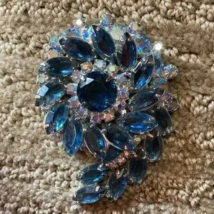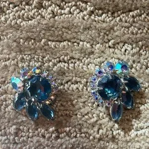 A pre-owned beautiful vintage Brooch/pin and clip/on earring set. The brooch is 2-1/2” wide and 2” tall. It is MISSING the needle part on the back of it. It’s an easy fix, It is blue rhinestones and AB rhinestones in silver tone metal. The earrings are 1”around. Other then the needle missing the the brooch, this set is in great vintage condition. I see no markings.
