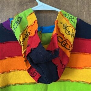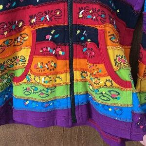 This jacket is very bright and vibrant. In excellent condition sewn to look like it is inside out. Front pockets. Long sleeves with hood. Measures approximately 19 inches across chest and 26 inches from shoulder to bottom hem. Sleeve length is about 21 inches. Smoke free home.