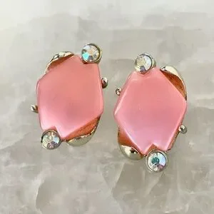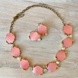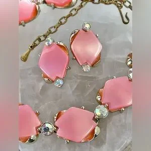 The unsigned gorgeous pink lucite set is accented with iridescent rhinestones. The necklace is adjustable in length due to hook closure / extension chain and the earrings are clip on. Perfect for spring and summer!!!!!