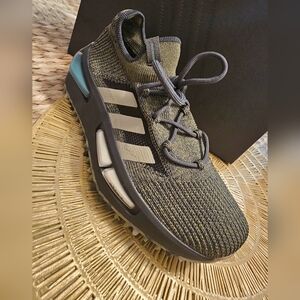 Adidas WOMEN'S NMD_S1 Focoli Shoes, Focoli/Slipeb/Carbon/Olive Focus Adidas sneakers with a modern design. Features a green knit upper with black accents. Perfect for casual wear.