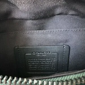 Rare green Coach track shoulder/belt is in excellent condition. Gorgeous leather with suede accents. Long zipper pocket on back and long zipper pocket on front with a smaller double zip pocket in center front.