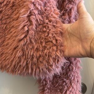 Excellent used condition. More of a dark salmon/dusty pink color. Very lightweight, polyester shell with a polyester/cotton lining. So soft and fluffy! Open front. No buttons or zipper. Two functional pockets. Approximately 19” from pit to pit and approximately 21” from the shoulder while hanging. Beautiful piece! Pet friendly, smoke free home.