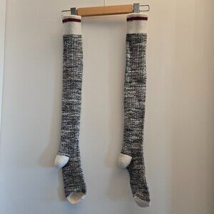 Stay warm and stylish in these comfy knee-high socks! Featuring a classic black-and-white marled knit and a sporty red stripe at the cuff, they measure approximately 19" from heel to hem. Perfect for layering under boots or wearing around the house on chilly days.