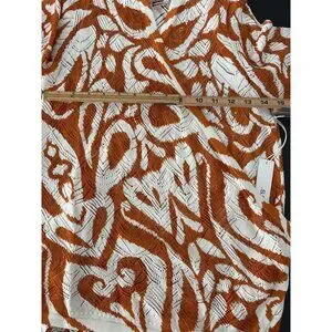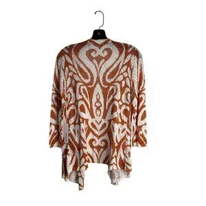 This lightweight cardigan makes the perfect layering piece during the warm weather months. 3/4" sleeves and open front is made from semi sheer cotton blend fabric with a bold abstract allover print in burnished clay.
