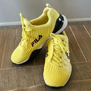 FILA court shoes. Pale yellow upper. Breathable mesh. Navy rubber soles. Very nice condition. Size 9