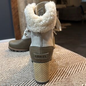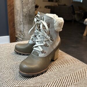 Sorel boots in gorgeous leather/olive green and suede/grayish with genuine shearling cuffs around the ankle and beautiful wood heels. In like new condition only worn twice.