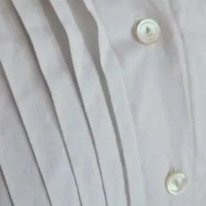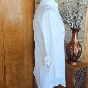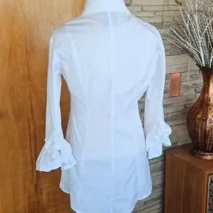 This elegant white top features a classic design with pleated and ruffle details. Perfect for any occasion, it offers a sophisticated look.
