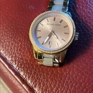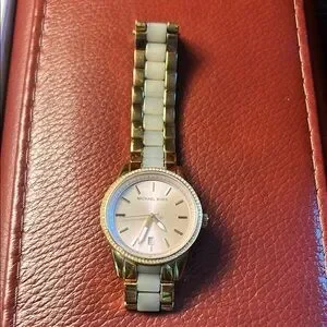 Elegant Michael Kors bracelet watch. Features gold and cream tones. Perfect for any occasion.
