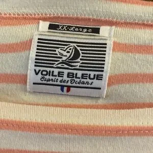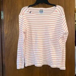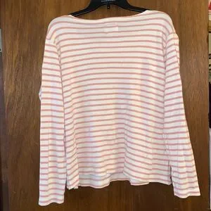 This pink and white te striped top is a unique addition to a a casual coastal look. This shirt has a top has a boatneck style ollar and is made from a comfy cotton like material.