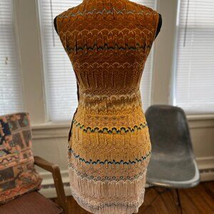 PRICE FIRM. abs gorg and vintage NWT in better qualith than they make now. Amazing piece of sculpture. I forgot I bought this, hence underworn. Its a special dress bc its great with pants and unbuttoning it makes it a bit aline, cross seasonal, very easy to wear and adapt with other textures. ( I am a weaver and textile lover and trave a lot for work and this is great bc you can roll it up for travel, does not wrinkle and wearing art!!! Great color that goes well with denim, leggings, skirts pants etc....amazing. mid thigh on most. Fitted. Missoni can run small, so xs- small. Waist stretches up to 13.5, hip up to 37 ( buttoned), extended unbuttoned. the neckline and sleeves does not stretch much ( i think this keeps the bendy woven quality in place but feels a bit odd putting on. When on, very comfortable. the top part is fairly fitted, the bottom is form fitted if buttoned and adusted a bit with less buttoning. I am not sure why but thought his pattern looked reptillic, bird- like and so many gorg references to nature. Wish it still fit.