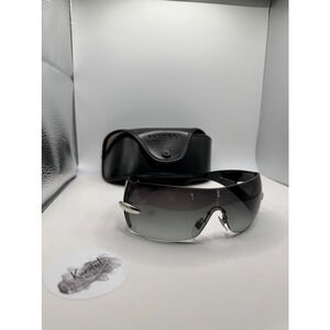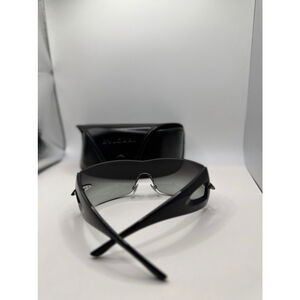 These pre-owned Bulgari sunglasses feature a sleek, rimless design with a black frame and gradient lenses. The lenses transition from dark to light gray. Silver accents adorn the temples. The sunglasses come with a black Bulgari-branded hard case. No scratches on the lens