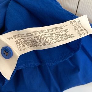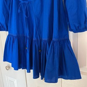 Cotton mini dress. Round neck and long sleeves and elastic cuffs. Tied self belt. Pronounced contrasting topstitching detail. Flounced hem. Front button closure.