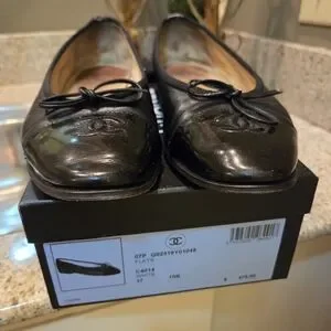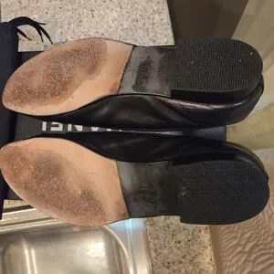 Elegant and timeless, these Chanel black women's shoes are perfect for any occasion. Crafted with attention to detail, they offer both style and comfort. These are worn but still have a lot of life left in them. The only flaw I could find is on the back of 1 shoe, (see pics) it's not hardly noticeable when wearing. I bought these a long time ago, recently got new ones. They have been lovingly cared for. Comes with original box and dust bag. Box says white, but I sold those already. I may have mixed up the boxes. Also, they were recently (within a year) resoled by a professional cobbler.