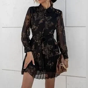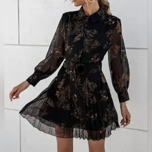 NEW Sheer Floral Print Chiffon Pleated Short Dress Long Sleeve Black