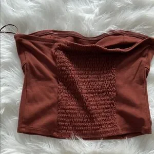 This stylish crop top from A New Day features a fitted bustier design in a rich brown hue. The straight neckline and subtle ruching add a touch of elegance, making it a versatile piece for any wardrobe. Crafted from a soft, textured fabric, it offers both comfort and sophistication.