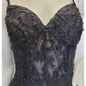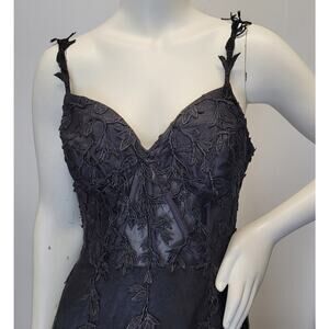 Lovely dress, perfect for any special occasion-- floral accents on the bodice, skirt, and straps. Classic sweetheart neckline, offset thigh slit, semi-sheer bodice. Has back closure that is half zip, half short corset. See photos for size chart. Spaghetti straps and full length skirt.