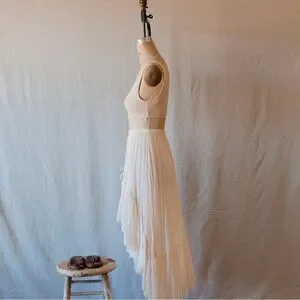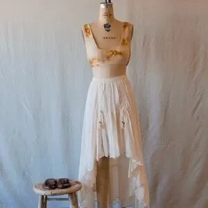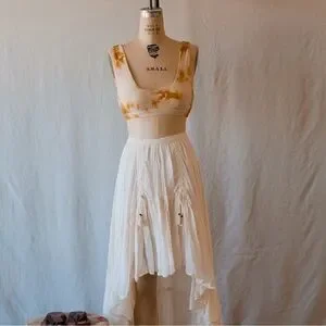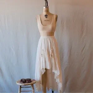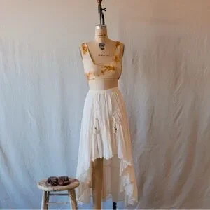 This Spell skirt in a soft cream hue features a graceful maxi length with an asymmetrical high-low hemline, perfect for a bride or wedding guest. Its A-line silhouette and lightweight fabric create a flowing, ethereal look that moves beautifully with every step.