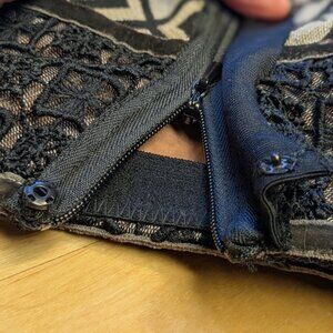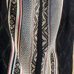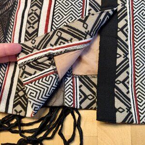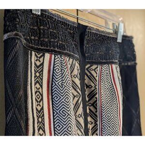 Gorgeous mixed-media pencil skirt with fringe detail by Byron Lars Beauty Mark, purchased from Anthropologie. Dominant colors are red, cream, beige, and black. The fringe has amazing movement. Material holds you in but with a slight stretch -- very flattering! Really wish I could still wear this...