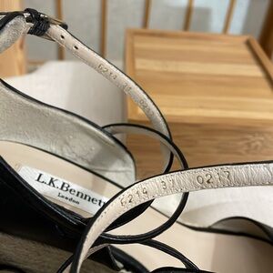 L.K. Bennett Nellie Peep Toe Espadrille Wedge Heel in Black Leather EU 37.5 /US 7 features Crisscross Straps, Gold Buckle Ankle Fastening and Synthetic Sole. 100% Leather. Made in Spain. Used in Very Good Condition.
