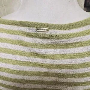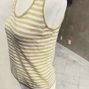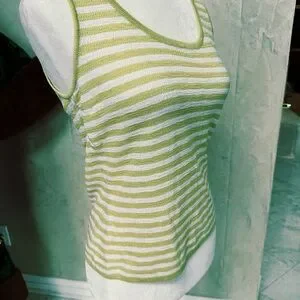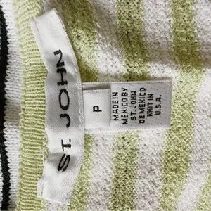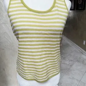 Never worn fitted tank top by St. John showcases a fresh white and yellow/green striped design, perfect for warm weather. The sleeveless style and lightweight fabric ensure comfort and breathability, making it an ideal choice for casual summer outings. Wool and rayon. Pit to pit 17.5" and shounder to hem 21.5"