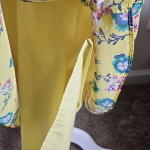 Yellow printed silk (100% Silk, Lining: 100% Polyester). Hourglass. Sleeveless. V-neckline. Center back zipper with hook-and-eye closure. Fully lined. 46" from shoulder to hemline. Imported.