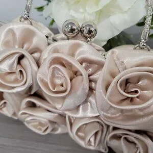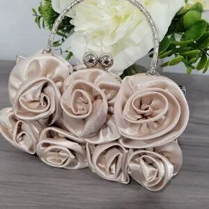 Elegant Latte Satin Roses Wedding Party Clutch Purse w/Rhinestone Handle & Chain