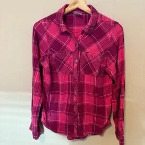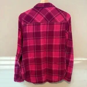 This is a pre-owned Columbia women's shirt in size Medium, featuring a pink plaid pattern with a button-up style and long sleeves. It is made of cotton flannel fabric, and is in good condition. The sleeves can be rolled up and secured with a button. The shirt measures 18 inches pit to pit and 24 inches from back collar to hem. From a smoke free home and washed according