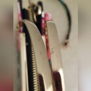 No rips or tears. Odor free. There are a few starches on the gold handles of the clutch.