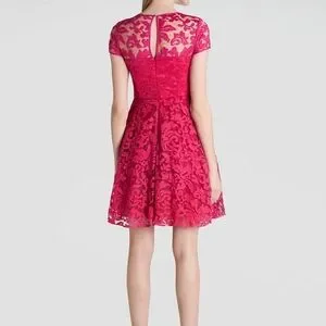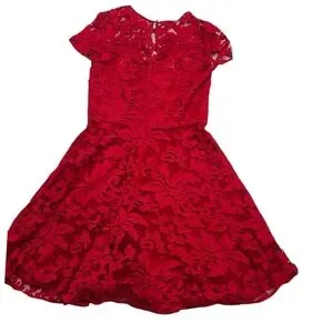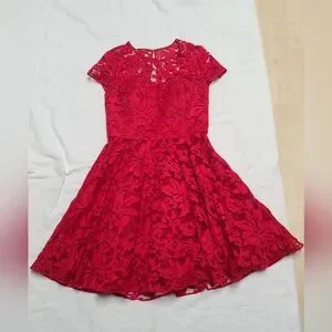 Designer Ted Baker Stunning short sleeve red. ted baker size 2 is a US size 6. This stunning red lace dress is perfect for any occasion. Its elegant design and vibrant color make it a standout piece in your wardrobe. fit flare style. in used condition. see pics for details of condition and measurements. Great for wedding guest, valentines day, date night, cruise formal night, anniversary