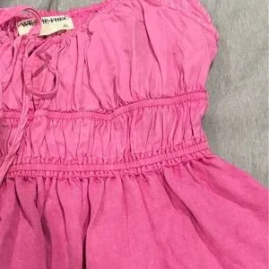 Shirred below bust; rounded hem