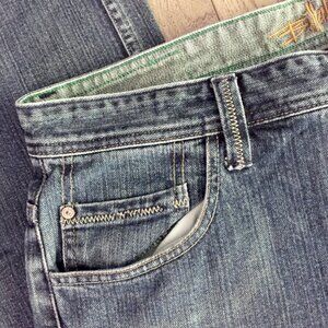 Billabong relaxed fit baggy jeans offer a comfortable style with a touch of casual flair. Maybe 90s / Y2K. The blue denim design is versatile for various looks. Relaxed fit style. Classic 5-pocket design. Zip fly with button closure. Unique back pocket X design. Durable stitching. Size 38 X 33. These Billabong denim are super retro cool!