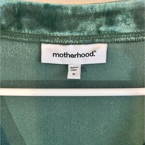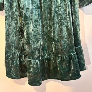 Green crushed velvet maternity dress. Babydoll style with ruffle hem.