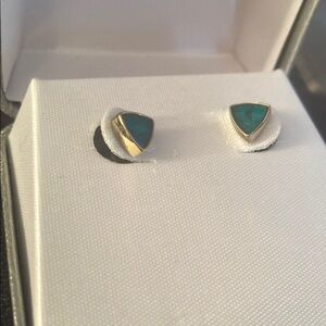 Elegant gold tone stud earrings featuring a striking blue green triangle design. Perfect for adding a touch of color to any outfit. Worn and sterilized.