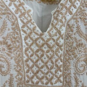 This elegant blouse from Roberta Roller Rabbit features intricate cream embroidery on a soft white fabric, with a beautifully embellished neckline and chest area. The tunic-style top showcases a harmonious blend of floral and geometric patterns, offering a sophisticated and balanced look.
