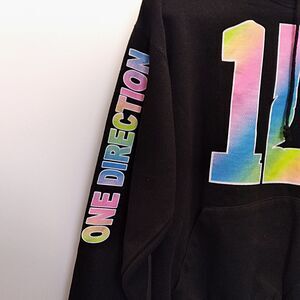 This is a women's multicolor graphics and black pullover hoodie featuring logos of the music band One Direction, including members Harry, Liam, and Zayn. The hoodie is in size M with a solid pattern, short raglan sleeves, and a crew neckline. Made of cotton or cotton blend fleece material, it is lightweight and suitable for all seasons. The hoodie also has a hood, a pullover closure, and is machine washable, perfect for active wear during activities like beach outings or cheerleading. The brand is Jon Lauren, and the fit is regular for comfortable wear.