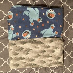 2 copper pearl swaddle blankets. One with evergreen trees design and one with Cookie Monster design.