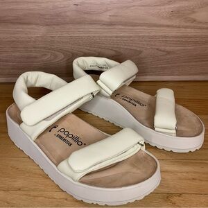Birkenstocks in the color Ecru in excellent condition, they have only been tried on. There is just a small mark on the sole from a sticker being removed but it isn't sticky or noticeable. They do not come with original box.