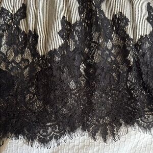 Gold Hawk 100% Silk skirt. One area of wear noted in pics. This elegant skirt features a sophisticated black lace trim and a subtle gray base, perfect for any occasion. Its timeless design adds a touch of class to your wardrobe.