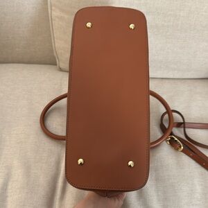 Classic Alma dome satchel style bag in natural colored raffia with tan leather trim. Gold hardware details throughout including a zipper top, fold down top handles that fit on the crook of the arm, and a removable and adjustable shoulder strap. Light signs of wear as shown. Clean lining in an eye-catching print. Lots of pockets including an exterior pocket that is great for a standard size cell phone.