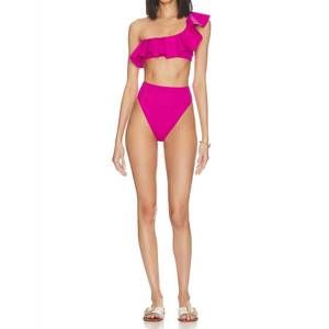 Make a statement this summer with the Mae Bikini Top by Cleobella, a head-turner in vibrant magenta with a striking paisley pattern. Designed for medium coverage, this one-shoulder swim top features a slip-on style with chic ruffled finishes. Crafted from an 80% recycled nylon and 20% elastane blend, it is ethically made in Sri Lanka for a perfect fit that flatters. Care instructions recommend hand washing cold and laying flat to dry.