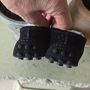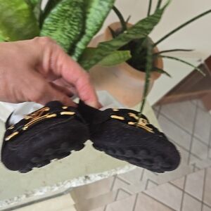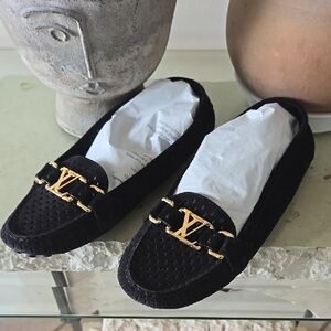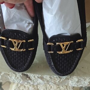 Elegant black Louis Vuitton loafers with signature gold accents. Barely worn, bottom rubber is almost new.