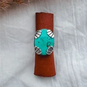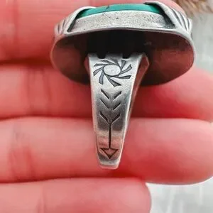 Vintage turquoise and sterling silver ring with hand stamped band and “shell” accents