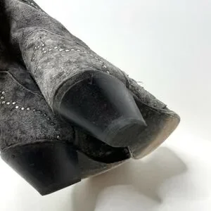 Harley-Davidson Jessa gray/black western styled motorcycle boots. made with the bestfull grain leather upper available work a full length soft cushioned sock lining, leather lined on the inside, work twin pull tabs on the top. Flamed toe finish with studs, stud accents at the top cuff and on heel with rugged western design and finish.