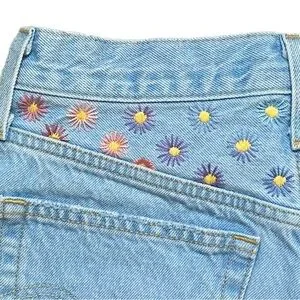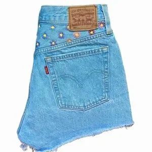 Life is too short to wear what everyone else is wearing. Why not stand out in a crowd? Upcycled Levi’s button fly 501 highrise jean shorts in a light blue wash features hand stitched multi colored daisies in a color gradient of dusty rose/mauve/teal and purple across rear yolk. Pink daisy accent on front coin pocket. Button fly closure. Distressed styling, approximately 2” inseam with frayed/raw hem edge. 10” rise. Hips approx 20” flat lay measured. 5 pocket styling with traditional copper rivets. This item is hand stitched by myself. Machine wash cool water in a garment bag to protect stitching. 100% cotton.