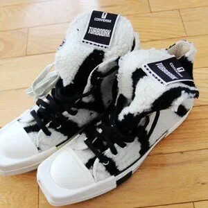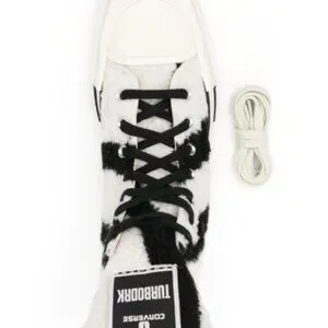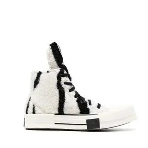 Rick Owens collaborates with Converse to design these Turbodrk Chuck 70 Sneakers. The unique pair are characterised by their soft zebra-patterned faux-shearling finish and unexpected square toe. Their high-top silhouette is elongated with an exaggerated tongue for an avante-garde finish, showcasing the brand's experimental approach.